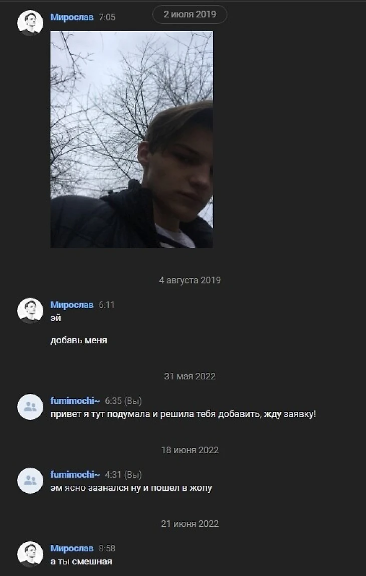 А еще Виктория утверждает, что состояла в отношениях с Мирой. У нас нет этичных способов проверить, правда ли это. Сама Фумимочи приводит в качестве доказательства скриншот переписки. Настоящий он или нет – решать вам.