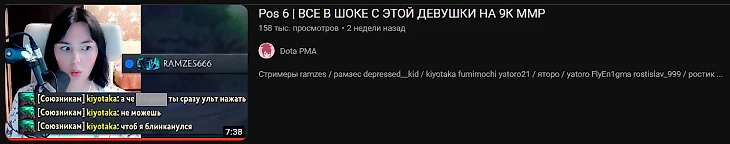Следующий большой всплеск известности случился недавно, когда Виктории достался аккаунт и девушка начала играть на 9к. Тогда она стала попадать в нарезки дотерских стримов на Ютубе и бесить зрителей стримов Дурачья и других.