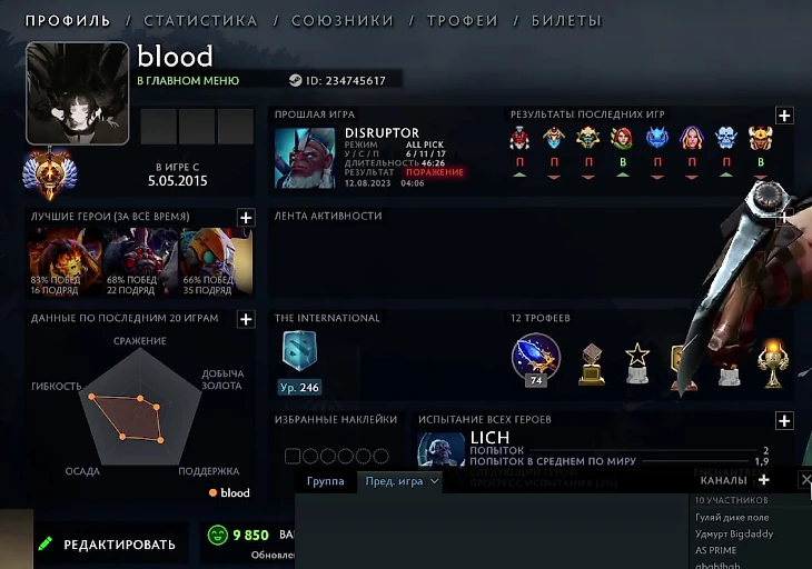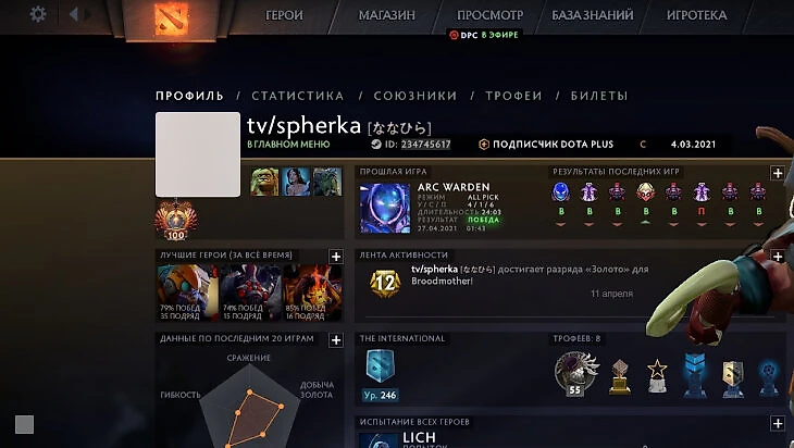 Видите внизу ссылку на Дотабафф? Она ведет на до сих пор активный аккаунт с 5к ММР, который тоже периодически появляется на ее стримах. Из интересного: у Виктории аж полторы тысячи игр на Паке и неплохой винрейт – почти 56%.