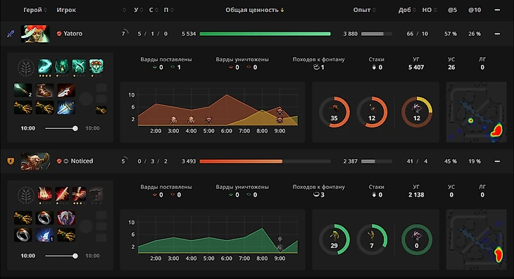 Kiritych – повсюду. Есть такой показатель, как урон/золото. Дота сбалансирована так, что в среднем на большой дистанции средний профессиональный дотер будет наносить 1 урон за 1 единицу золота. Худшие показатели, как ни странно, обычно у керри. Лучшие – у мидеров.