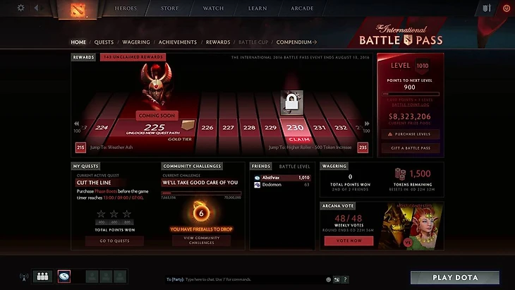 В таком виде Компендиум появлялся еще дважды, и оба раза с новыми рекордами. А в 2016 году разработчики представили совершенно новую систему – Battle Pass. Начальный доступ все так же стоил $10, но появилось важное отличие. Теперь у каждого собственная линия наград, которая зависела только от количества вложенных лично игроком средств. Награды можно было получать и выполняя задания в игре, но купить уровни – быстрее и проще.