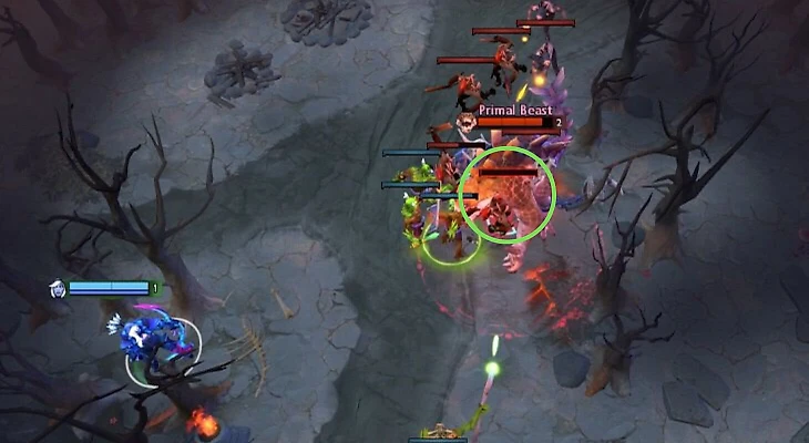 6. У Праймал Биста огромный хитбокс, и этим лучше пользоваться на линии: наступайте в модельку крипа, чтобы мешать врагу добивать их. Работает и с союзными, и с вражескими крипами. Даже с вардами!