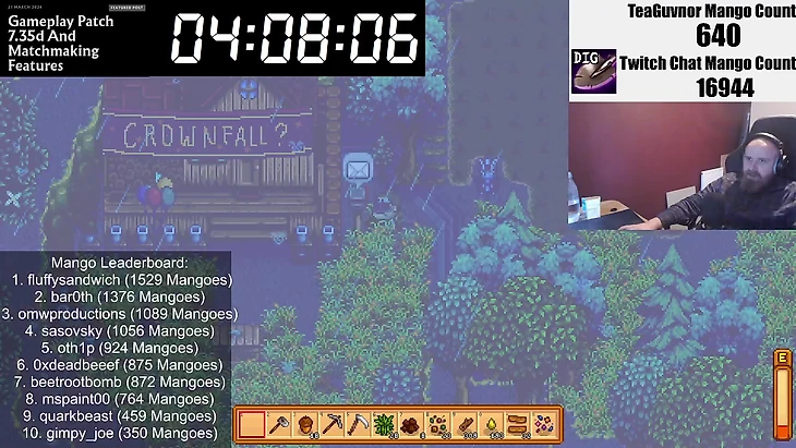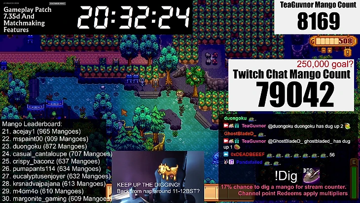 Только вот прошла уже целая ночь. Файлы все подргужаются, у Викрама – ничего нового с конца марта, а стрим бедняги TeaGuvnor на момент написания текста уже пробил 20 часов. Теперь уже вместо Робсона манго с деревьев собирает его стул (и зрители).