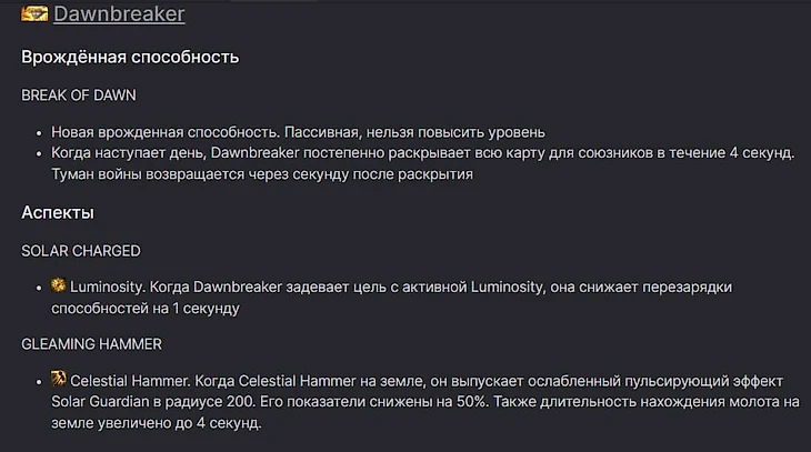 Обратите внимание на врожденную способность Dawnbreaker. На целые 4 секунды каждые 10 минут она раскрывает всю карту. Команда сразу собирает информацию, получают преимущество по карте, которое можно реализовать в успешном ганге, атаке на рошана или спокойной фармежке. Помимо этого аспекты - совсем новые, данных способностей у героя не было.