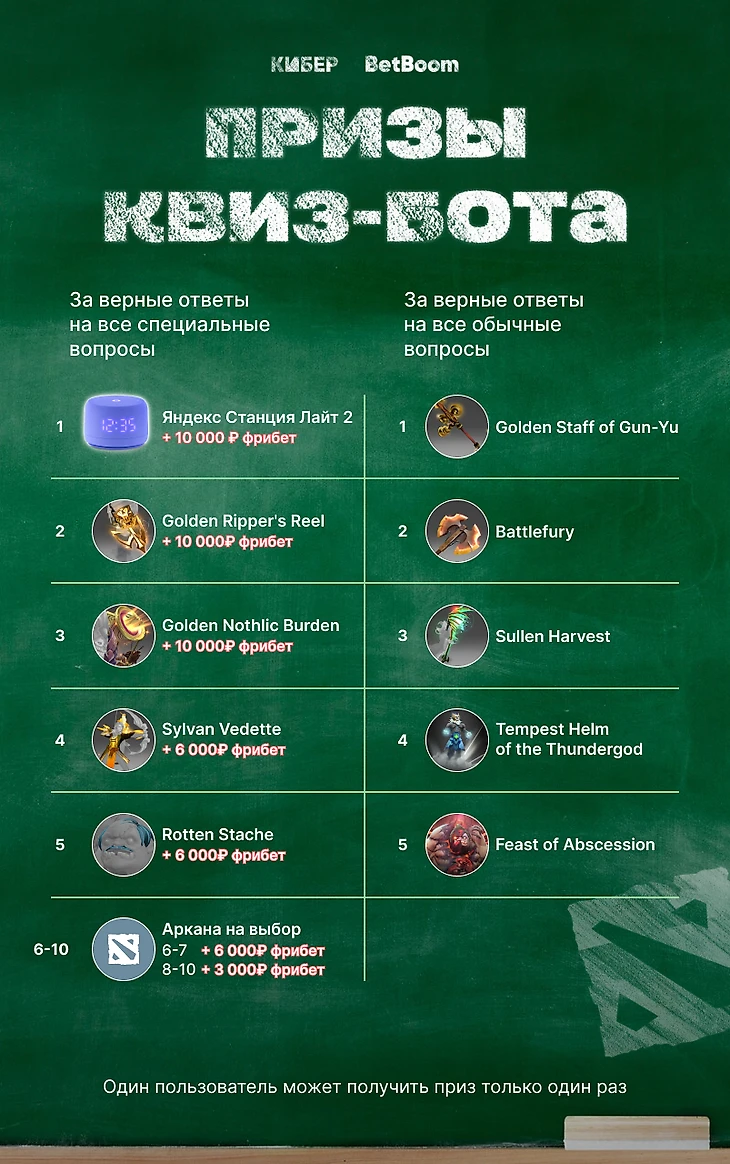 Квиз-бот врывается на The International 2024! Каждый день отвечай на вопросы про Доту и турнир в Копенгагене и участвуй в розыгрыше классных призов, которые мы подготовили вместе с нашими друзьями из BetBoom.
