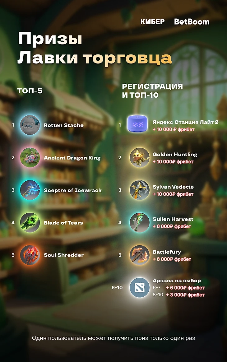 К TI13 Кибер вместе с BetBoom снова запускает Лавку торговца – это бот, в котором ты станешь владельцем потайной лавки. С 4 сентября по 4 октября получай заказы от героев Доты, собирай для них предметы и выигрывай призы!