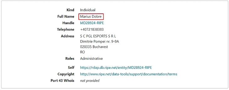 Если у вас вдруг остались сомнения – вот еще одно подтверждение. Помимо основной сети для организации зарегистрировано еще две группы IP-адресов: административный и технический. Административный зарегистрирован на человека с именем Мариус Добре.