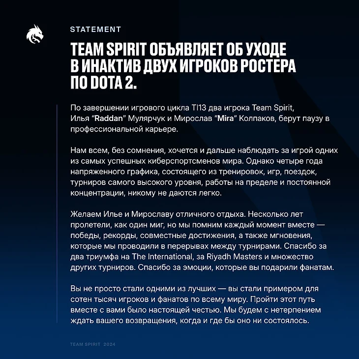 18 сентября 2024 года Team Spirit объявила об уходе Раддана и Миры в инактив.