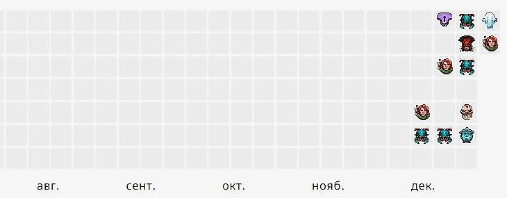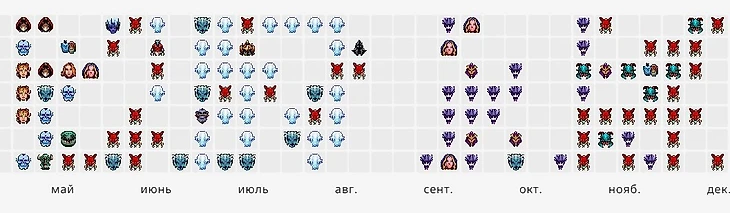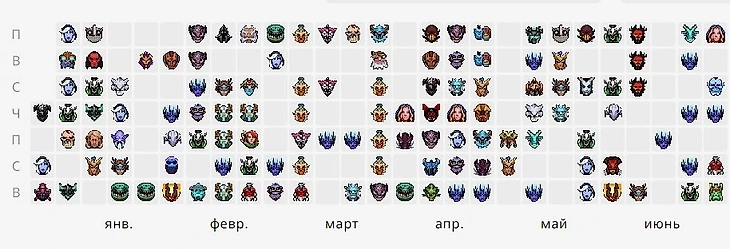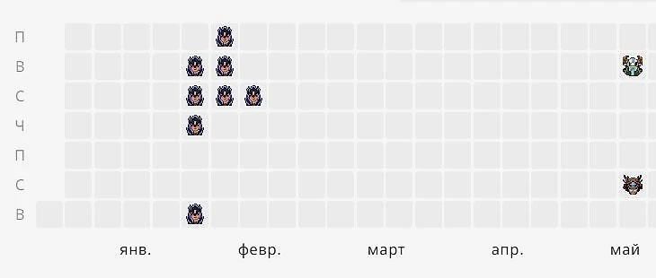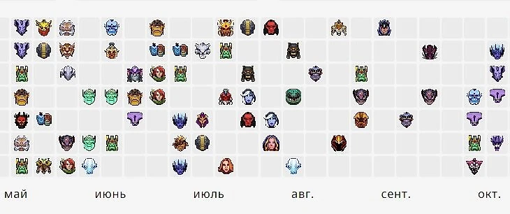 Иконками героев на календаре отмечен самый популярный герой в тот день. Условно: я сыграл 10 матчей за день из них 5 – на Вивере, значит этот день в календаре будет отмечен его иконкой.