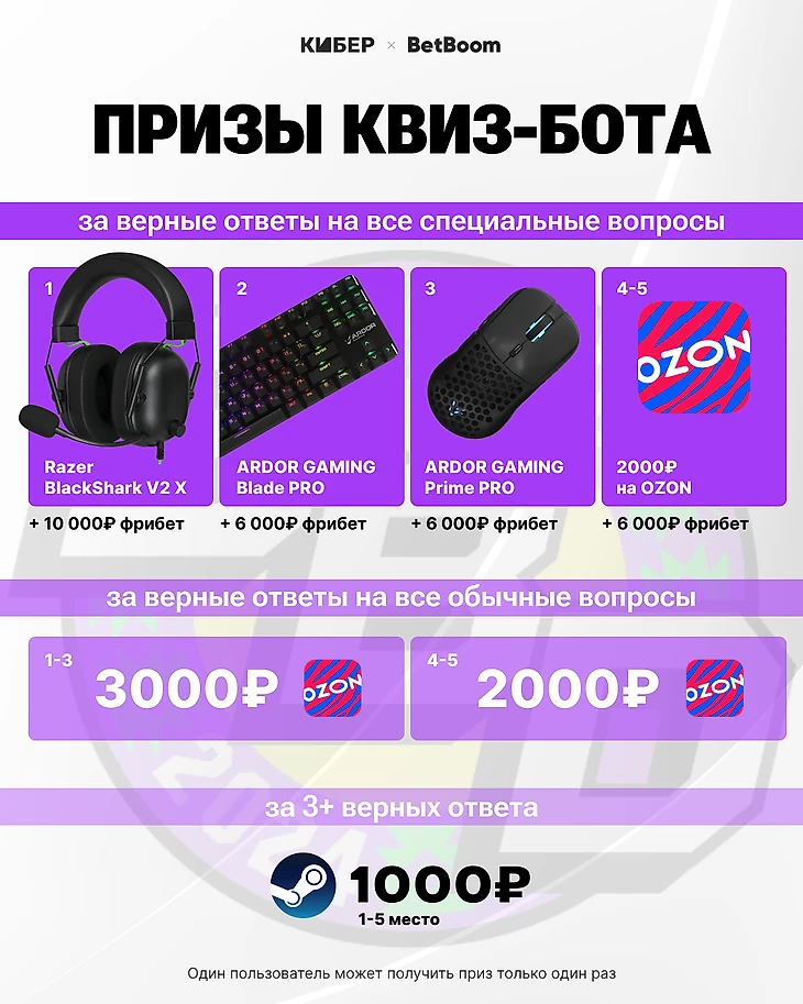 2. Среди тех, кто верно ответит на 3 и более вопроса, мы разыграем пять пополнений кошелька Steam на 1000 рублей!