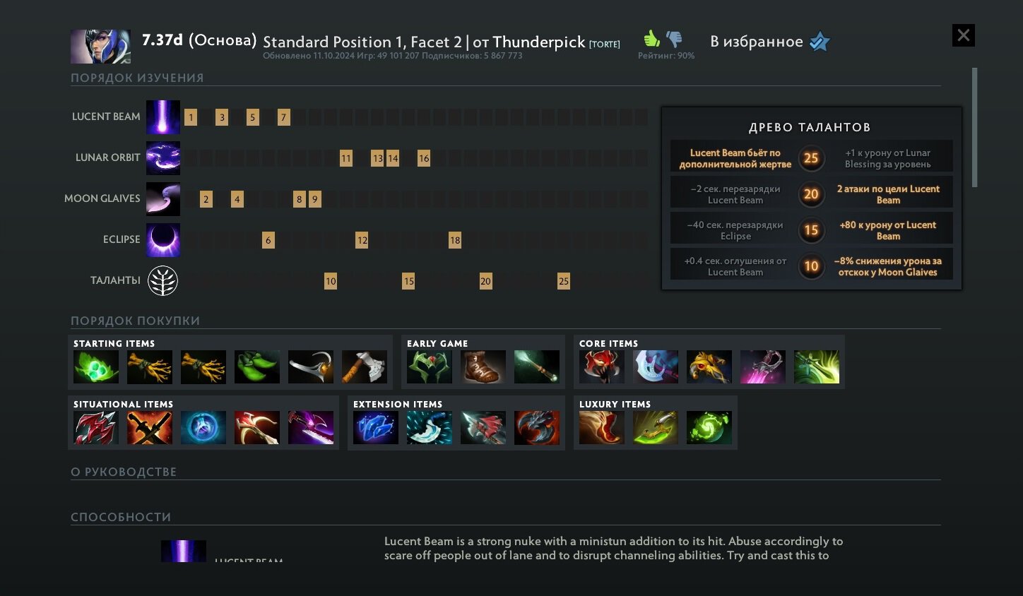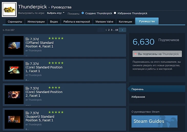 Пожалуй, самый популярный автор руководств в Доте скрывается под ником Thunderpick – именно здесь находятся все гайды Майкла «Torte de Lini» Коэна. Они лаконичны и просты: для кого-то это будет огромным плюсом, а для кого-то серьезным минусом. Здесь собрана абсолютная база для игры на всех рейтингах – необходимый минимум для игры на герое.