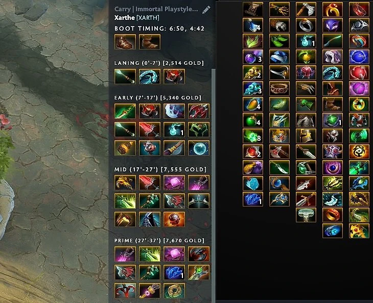 Xarthe написал скрипт, который собирает информацию о метовых героях и автоматически создает руководства. И выглядит это очень неплохо! Самое крутое в гайдах Xarthe – здесь расписаны примерные тайминги предметов относительно общей ценности героя. Довольно удобно.
