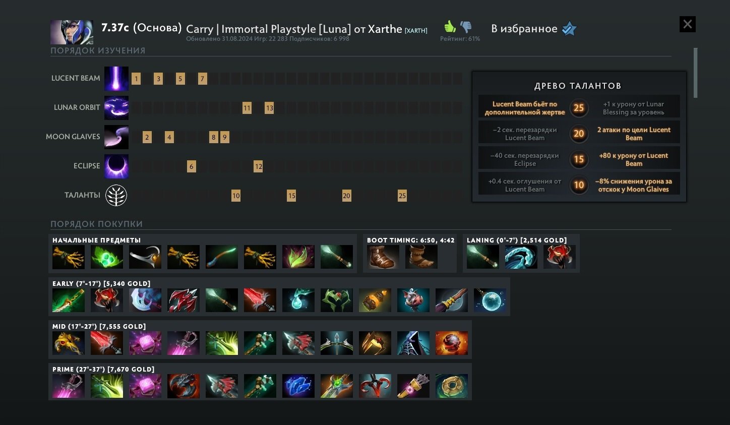 К тому же гайды Xarthe часто отличаются наиболее высокой точностью к тенденциям. Например, Luna в его руководстве не максит Lunar Orbit, как и положено, в то время как у Торте и ИмморталФэйта зачем-то максит, да и с талантами полный порядок. А еще в ее сборке есть обязательный Wind Lance к Power Treads и Mask of Madness, что давно стало общим местом.