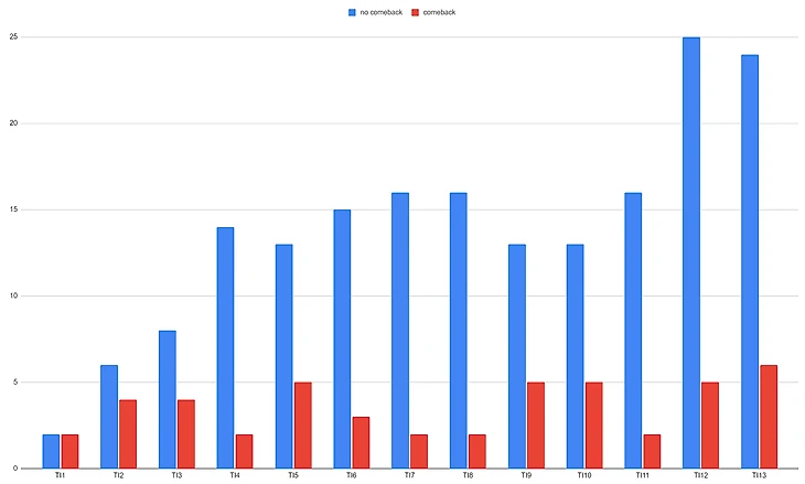 Как видим, на каждом конкурентном турнире с большой выборкой процент камбэка с 0:1 не достигает даже 30%. А общая статистика: 47 камбэков из 228 матчей, что составляет 20,6%.