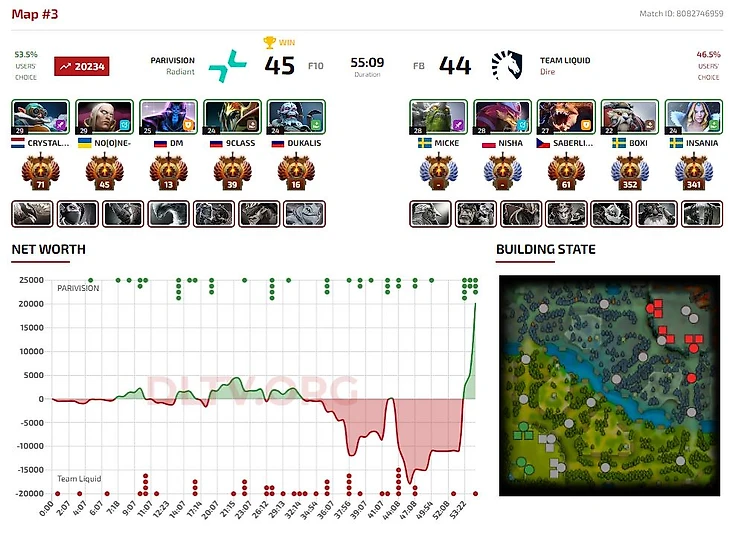 Очередным украшением турнира стала третья карта. Абсолютно равная игра до 30-й минуты, после которой Liquid выиграла важную драку и пошла на хайграунд. Но сделала она это очень рано… Да, «жидкие» вели порядка 14к золота, но забыли о сигнатурном Никсе от 9Класса и о не менее фирменной Энигмы от DM’а. PARIVISION отбилась, но через несколько минут снова проиграла сумасшедшую драку на Рошане. Аегис для Liquid и около 20 тысяч преимущества сверху. Но вновь проклятое ХГ для «жидких» против Никса и Энигмы… PARIVISION шикарно нажала кнопки около своей базы, защищая нижнюю сторону. Блэкхол в Пангольера, залпы от Гирокоптера Кристаллиса – Liquid в таверне. Полностью перехватила инициативу восточноевропейская команда через несколько минут все так же на нижней линии. Пангольер умер после байбэка, а DM не ошибся с Блэкхолом, как было на BLAST Slam с BB Team. Первое появление PARIVISION на ХГ противника увенчалось успехом – трон упал за несколько секунд. 45:44, 55 минут, 2:1 за «бандой Нуна». Просто посмотрите на эти графики!