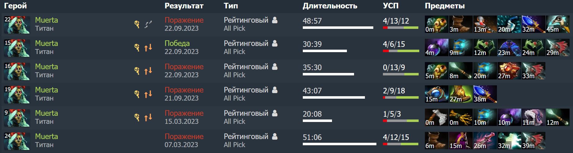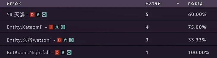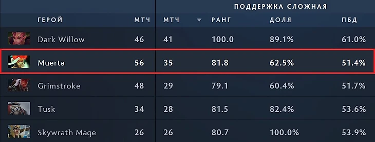 «Герой относительно новый, так что все возможно. Но почему бы не проверить?» – подумал я и... проверил! Я изучил ВСЕХ «четверок» в истории Доты, кто сыграл на Муэрте в про-Доте больше 5 игр. Почему? Ну не может «создатель» провести меньше в компетитив!