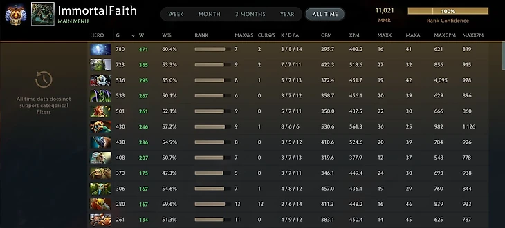 Предыдущую отметку (10 000 рейтинга) Даниэль достиг в июне 2023-го, то есть на еще одну тысячу MMR ушло почти полтора года. ImmortalFaith играл на разных героях и ролях (в основном саппорты), но главным его персонажем в походе за 11 тысячами стал Bounty Hunter.