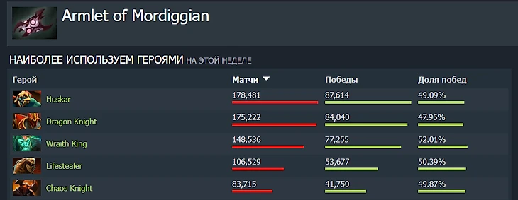 На Хускаре Armlet of Morddiggian берется всегда, сразу же после коричневого ботинка. На остальных героях вещь опциональная, рассчитанная на раннюю агрессию и активную игру. Берется второй шмоткой после ПТ или Фэйзов.