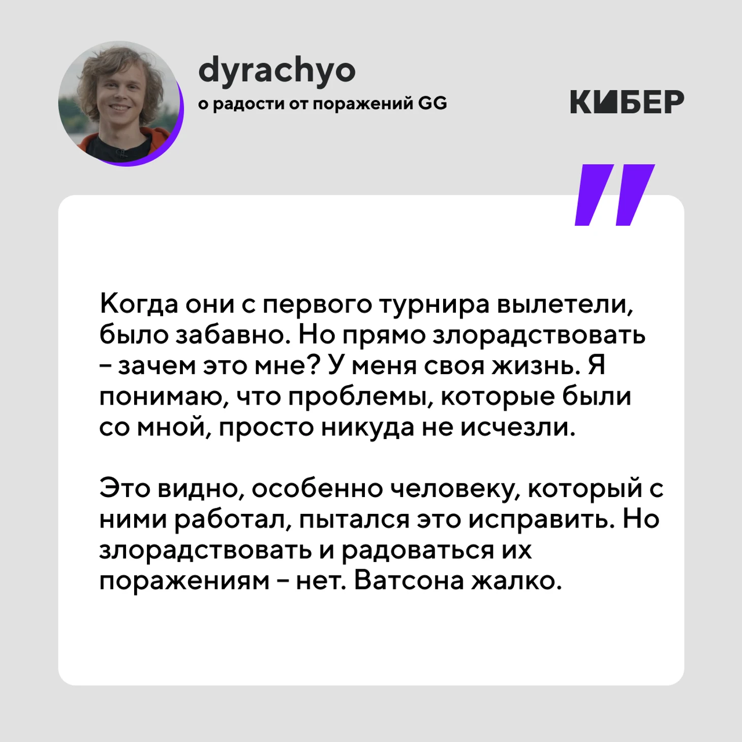 – Да нет. Просто когда с первого турнира они вылетели, было забавно. Но прямо злорадствовать – зачем это мне? У меня своя жизнь. Я понимаю, что они проиграли, и проблемы, которые были со мной, просто никуда не исчезли. Это просто видно, особенно человеку, который с ними работал, пытался это исправить. Но злорадствовать и радоваться их поражениям – нет. Ватсона жалко.