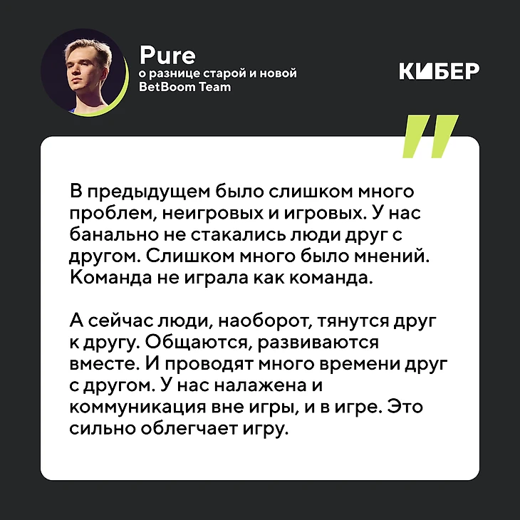 – Это очевидно. В предыдущем было слишком много проблем, неигровых и игровых. То есть у нас банально не стакались люди друг с другом. Слишком много было мнений. И по итогу это приводило к тому, что команда не играла как команда. А сейчас люди, наоборот, тянутся друг к другу. Как-то общаются, развиваются вместе. И проводят много времени друг с другом. Соответственно, у нас налажена и коммуникация вне игры, и в игре. Это сильно облегчает игру.