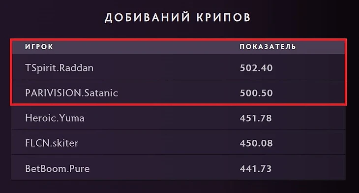 ◾ Крипов в минуту: 11,94 (топ-1) против 10,96 (топ-2) у Яторо. По добиваниям крипов за матч картина та же.