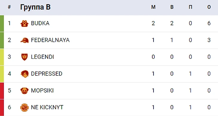 Команды MOPSIKI и DEPRESSED делят последнее место с нулями очками, команда LEGENDI сегодня не играла, соответственно имеют тоже 0 очков.