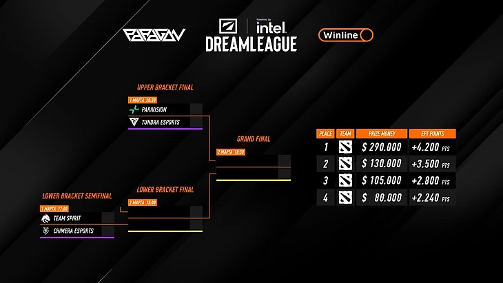 Плей-офф турнира стартует уже 1 марта. Стадию откроет встреча между Chimera и Spirit, затем в бой вступят PARIVISION и Tundra. Финал нижней сетки и гранд-финал запланированы на 2 марта. Проведите эти выходные за просмотром решающих матчей DreamLeague 25 на Ютуб- и Твич-канале Paragon. Встречаемся 1 марта в 17:00 по московскому времени!