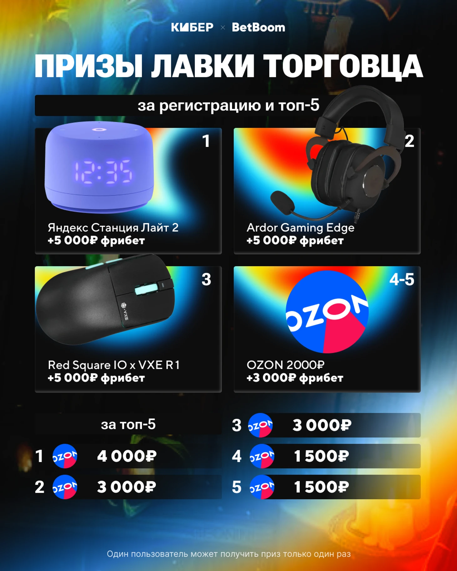 4-5-е место: Сертификат OZON на 2000 рублей и фрибет 3000 рублей.