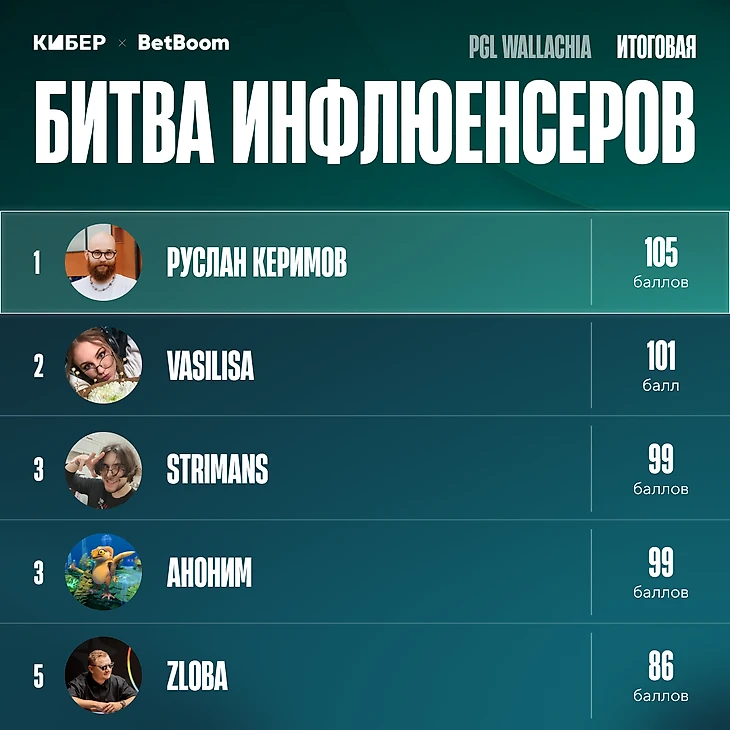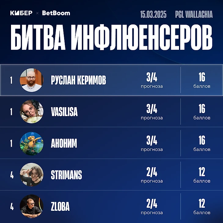Пошел финальный день Битвы Инфлюенсеров. Вместе с нашими друзьями из BetBoom мы следим за предиктами известных и умных людей. Предсказания дают Василиса, Стриманс, Руслан Керимов, Злоба и загадочный аноним!