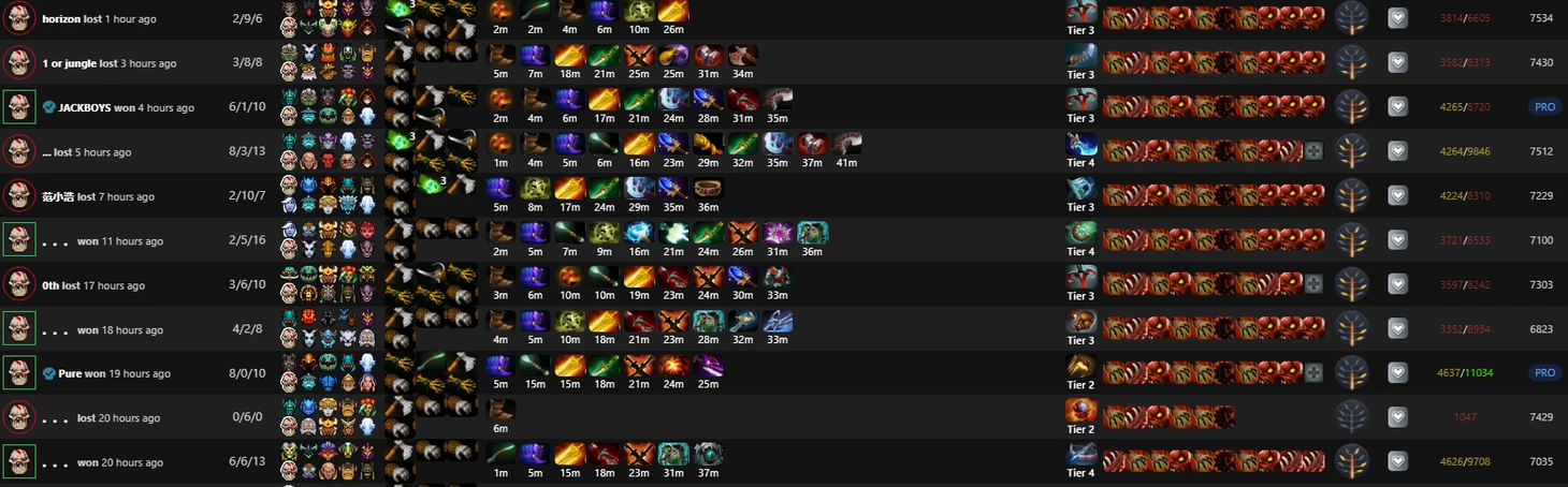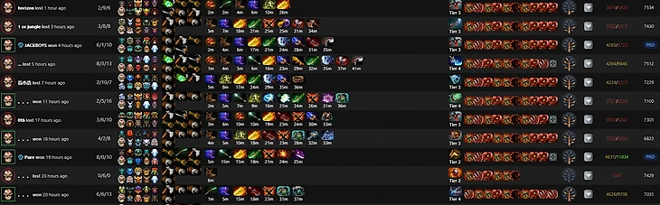 Opendota – отдельная статистика по задротам конкретных героев. Можно выцепить аккаунт и игры, если у человека ниже 8500+ MMR – украсть пару фишек. Порой такие игроки знают про героя куда больше, чем профессионалы!