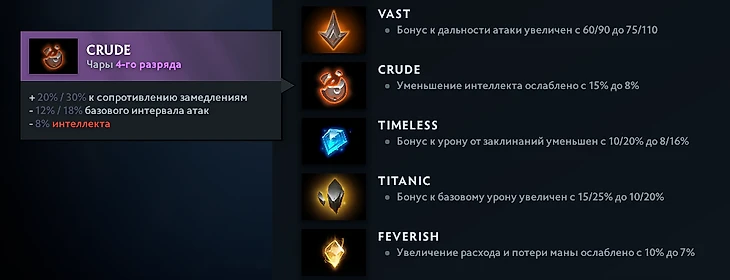 К тому же многие магические чары пострадали, в том числе Mystical. Бонус манарегена упал с +1/2/3/4 до + 1/1,75/2,5/3,25. А у физических чар понерфили только Titanic: бонус к базовому урону уменьшен с 15/25% до 10/20%.