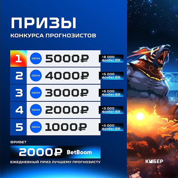 1-е место: сертификат Ozon на 5000 рублей и фрибет 8000 рублей от BetBoom