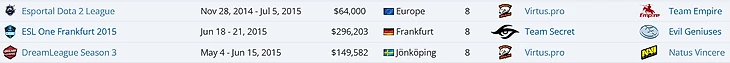 В 2015-м было два тир-1 турнира с двумя нашими командами в финале. Это 3-й сезон Дримлиги (чтобы вы понимали, скоро будет 26-й) и некий Esportal Dota 2 League.