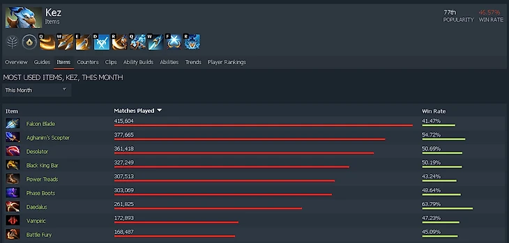 Но в умелых руках Кез превращается в грозное оружие. В марте игрок EternalXSadness добился на нем невероятного результата — 157 побед в рейтинге подряд. В каждой катке он собирался через один и тот же билд с Phase Boots, Falcon Blade, Desolator, Aghanim’s Scepter, Blink Dagger и Daedalus.