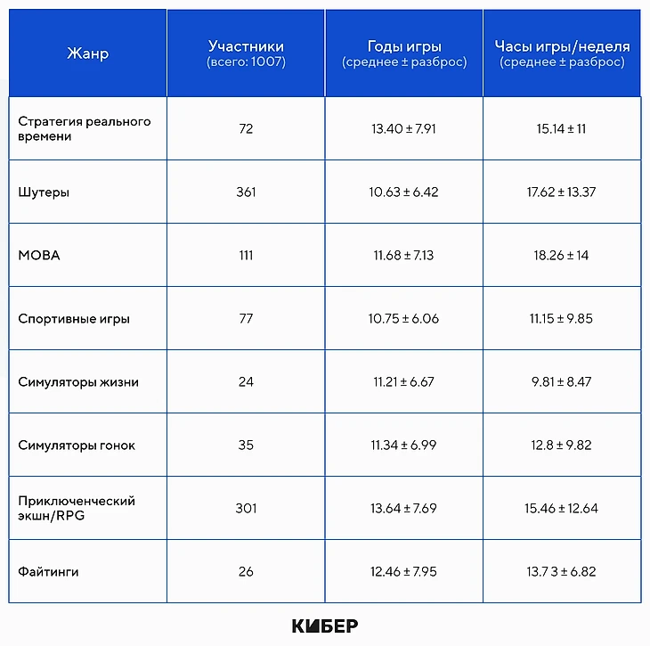 Из 1007 человек 797 – мужчины. Средний возраст опрашиваемых 24 года, самому молодому респонденту 18 лет, самому старшему – 32. Участники опроса играют в среднем 16 часов в неделю, самый заядлый геймер – 28,5 часов. Средний игровой стаж выборки 12 лет, у самого опытного игрока за плечами 19 лет.
