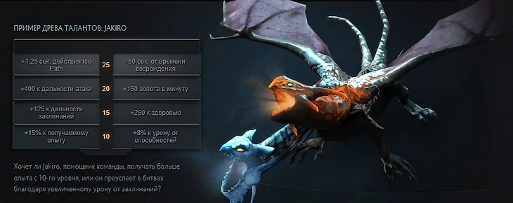 В одном из патчноутов Valve спрашивала: выберете вы на Jakiro дополнительный опыт или магический урон. Но единственное место, где в этом древе талантов был выбор – это 15-й уровень. Бонус к опыту ускорял получение сильных талантов, +150 золота в минуту гарантировали предметы даже на пятерке, дефающей мегакрипов. А -50 секунд от времени возрождения позволяли вообще не бояться смерти где-либо, кроме собственной базы. Зачем тратить байбэк, если ты все равно возродишься раньше, чем соперник дойдет до твоего хайграунда?