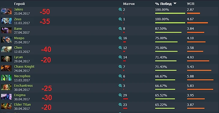 На Kiev Major такие герои обеспечили огромное преимущество многим командам. На скриншоте – герои с лучшим процентом побед на турнире (красными цифрами – снижение времени возрождения от таланта). Всего в Доте на тот момент было около 40 героев с такими бонусами.