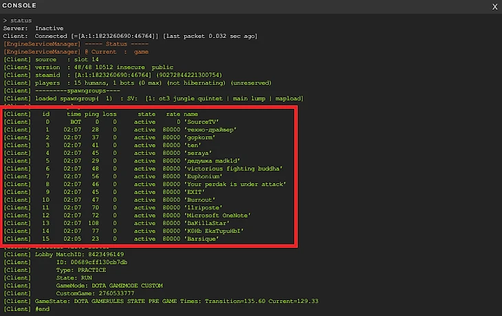 Если вам интересно, как узнать пинг через консоль или как посмотреть пинг игроков в Доте 2, то в этом тоже нет ничего сложного. Достаточно во время самой игры открыть консоль и ввести команду “status”, после чего отобразится информация о всех участниках матча. Ищем нужного игрока по нику и смотрим на третий столбец.