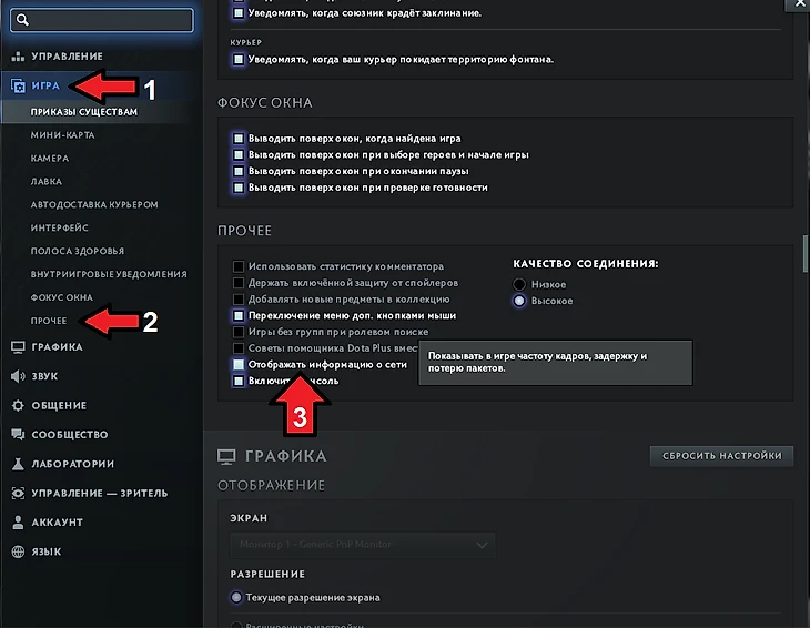 Как в Доте включить ФПС и Пинг? Очень просто – нужно включить информацию о сети внутри игры. Для этого нужно зайти в настройки, раздел “Игра”, подраздел “Прочее” и включить опцию “Отображать информацию о сети”