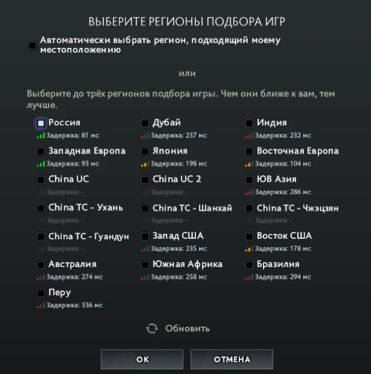Как проверить пинг в Доте? Чтобы узнать пинг перед матчем, нужно зайти в раздел выбора регионов (Открываем вкладку с матчами справа на главном экране, нажимаем на название выбранного региона внизу). Здесь вы можете узнать задержку во всех доступных регионах и выбрать те, которые вам будут удобнее.