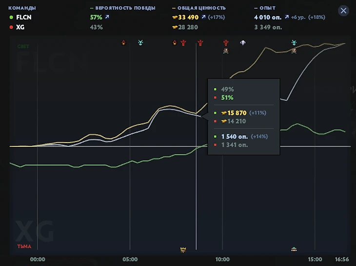 Этот график высчитывает примерные шансы на победу каждой команды на каждом отрезке игры. Система не считает скилл игроков — только ситуацию на карте, сравнение пиков и их силы в моменте, перевес по золоту и опыту. Анализатор сравнивает эти данные с другими похожими матчами и их конечными результатами, после чего выдает итоговый шанс победы в процентах.