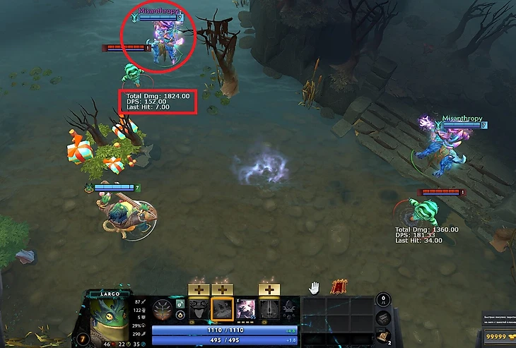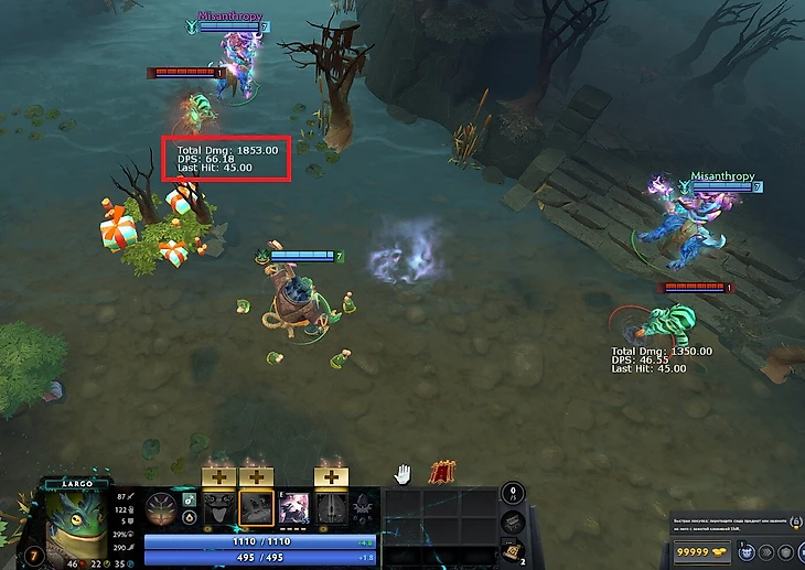 Для наглядности: два Лешрака с Misanthropy и Diabolic Edict 4-го уровня, и Ларго с 4-м Croak of Genius. Тот Лешрак, что был под баффом Лягушки-барда, нанес второй способностью на ~500 урона больше.