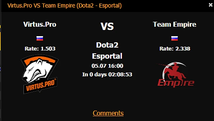 Очень интересное противостояние двух организаций из России за 32 000 $ и шанс показать, кто сейчас является "царем горы" на СНГ дота-сцене. История личных встреч говорит в пользу "медведей", последняя встреча была совсем недавно, и закончилась очень уверенной победой VP  по результату и по игре. За Empire говорит то, что у команды больше опыта сражений в финальных играх. Также "Имперцы" сейчас находятся на буткемпе, и это начало давать свои плоды в последних матчах. После поражения от Vega были выйграны 4 карты подряд у 4ASC и тех же Vega. С российской командой удалось взять эффектный реванш( карты были выйграны за 29 и 23 минуты ) и теперь Empire попытаются нанести ответный удар и "медведям".