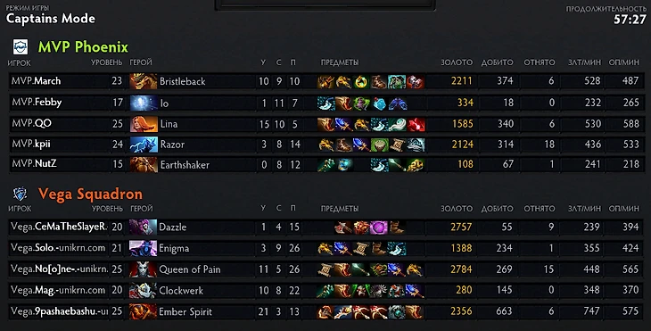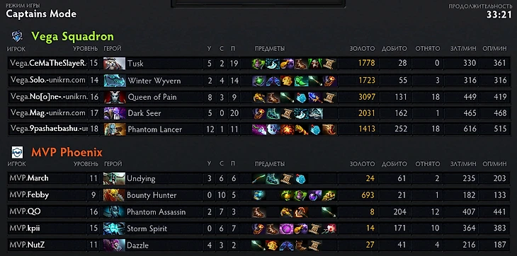 Вернуться в игру героям Vega. Эмбер Спирит в игру вернулся: лишь на 22 минуте появился батлфьюри, а через 20 минут у него уже было 5 слотов. Остальные постепенно теряли свою актуальность. В команде не появилось ни одного хекса или еула.