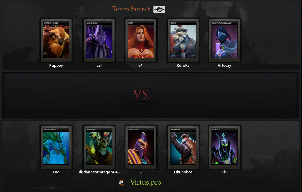 В первой игре s4, который капитанит в Team Secret выбрал для своей команды EarthShaker, Dark Seer, Lina, Tusk и Templar Assasin. Fng забрал Naga Siren, Silencer, Magnus, Rubick и под самый конец Medusa для Иллидана. Явление Медузы несколько удивило – но это был очень хороший пик под Иллидана, который очень много на ней отыграл в бытность команды VP.Polar. Её сила в том, что собранную в шесть слотов медузу убить практически невозможно, она в одиночку способна защищать базу даже против мегакрипов, а потом пойти и развалить команду соперника. Но до этого еще нужно дожить, как и большинство лэйт-гейм персонажей, медуза в начале не очень сильна.