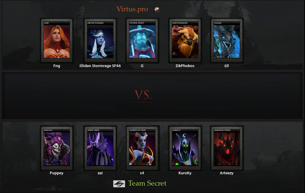 Вообще, главная беда звёздных стаков, из турнира в турнир одна и та же – почуяв свою силу они перстают играть на полную. Именно так те же Secret после 15-0 на групповом этапе в одну калитку вылетали с Dota Asian Championship (да боже, мы тут всех даже с Techies разваливаем, кто нам что сделает?!), так уже происходило на International, когда они вылетели от EHOME. Поэтому ко второй карте Secret подошли расхлябано. Ну а Virtus.Pro нечего было терять – проигрывать Team Secret в борьбе за top-6 не зазорно. Но зачем проигрывать, если есть ещё одна карта? Умница Fng снова банит Bounty Hunter (и сделает это в первой стадии банов во всех трёх картах), забирает себе Лину, Иллидану Сайленсера, Году Шторма, Фобосу Шейкера, а Лилу Визажа.