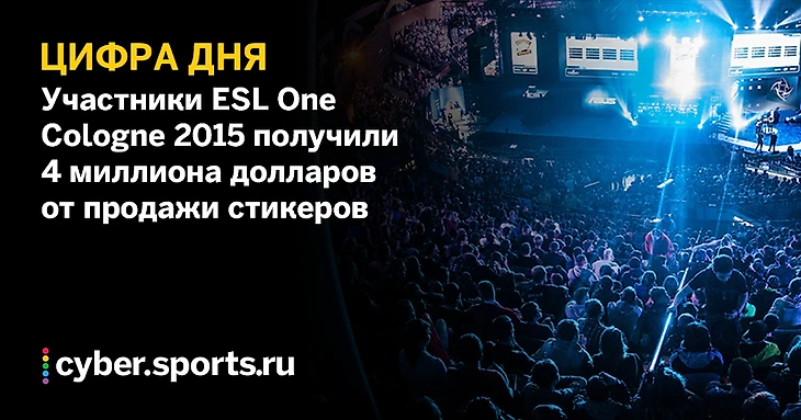 Компания Valve сообщила, что команды-участники турнира ESL One Cologne 2015 по Counter-Strike: Global Offensive получили 4 миллиона 200 тысяч долларов. В сумму входит изначальный призовой фонд и деньги от продажи стикеров с автографами игроков. Если учесть, что призовые деньги составляли 250 тысяч долларов, то получается, что одни только стикеры принесли 3 миллиона 950 тысяч долларов игрокам. В результате киберспортсмены получили больше, чем когда-либо на турнирах по CS:GO.