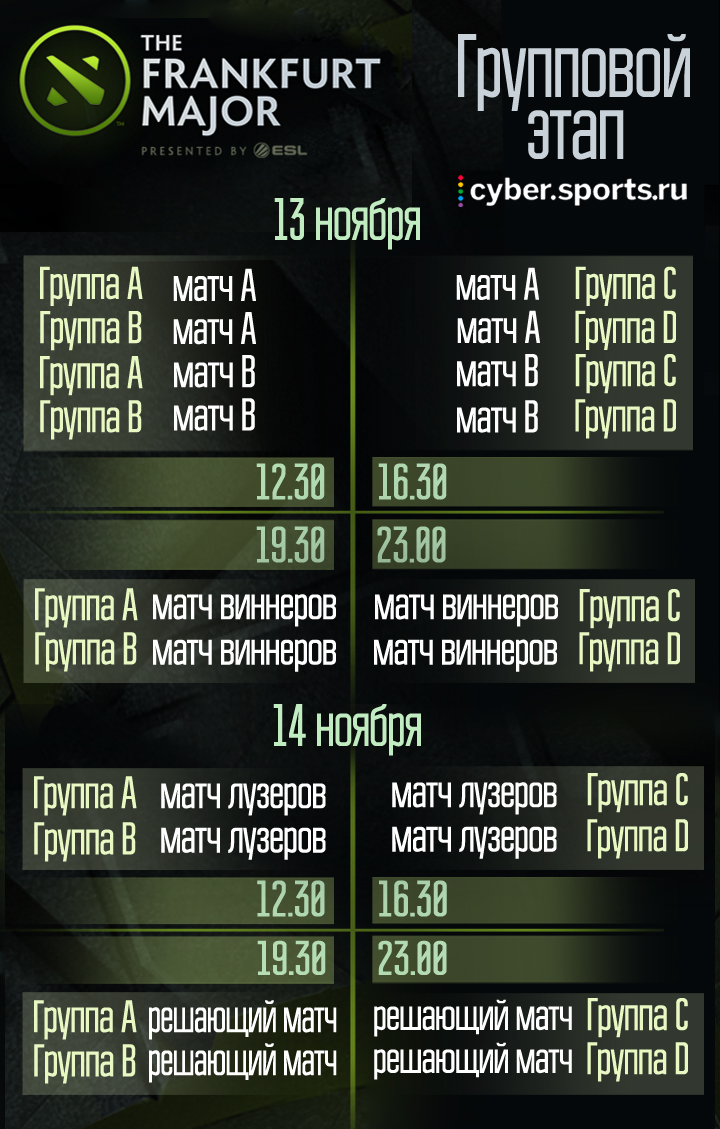 Уже 13 ноября во Франкфурте стартует групповой этап Major-турнира. Шестнадцать участников разделят на четыре группы. За два дня команды сыграют 20 серий best of 3. По итогам матчей лучшие коллективы отправятся в верхнюю сетку плей-офф, худшие — в нижнюю.