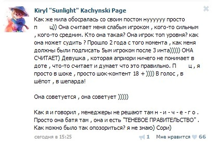 Если верить словам Sunlight‘а, Мила – теневое правительство Team Empire, команда скатилась до уровня tier3 коллектива исключительно из-за неё, а саму девушку в довершение своей мысли назвал чудовищем. Каким конкретно образом игрок пришёл к таким выводам, он в своём посте не уточняет. На просьбу конкретизировать ситуацию и предоставить какие-то доказательства юноша ответил, что не хочет ссорить людей и доказывать ничего не собирается: