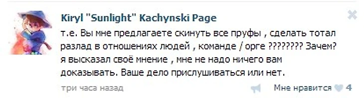 На мой взгляд, пост Sunlight‘а доказывает, что то решение (неважно, кто его принял: StrangeR, Silent, Mila или Жанна Агузарова) было верным. В команде самое главное – это уважение друг к другу, а когда парнишка на всё комьюнити называет своего потенциального «тиммейта» подкаблучником без собственного мнения, уважением и не пахнет. Но самое страшное, что прямо сейчас Silent играет в команде с кем-то, кто думает о нём точно так же. С кем-то, кто на вопрос Санлайта о причинах отказа ответил, что это было решение Милы. И вот от этого мне так мерзко, что хочется пойти в душ и не вылезать до самого «решафла».